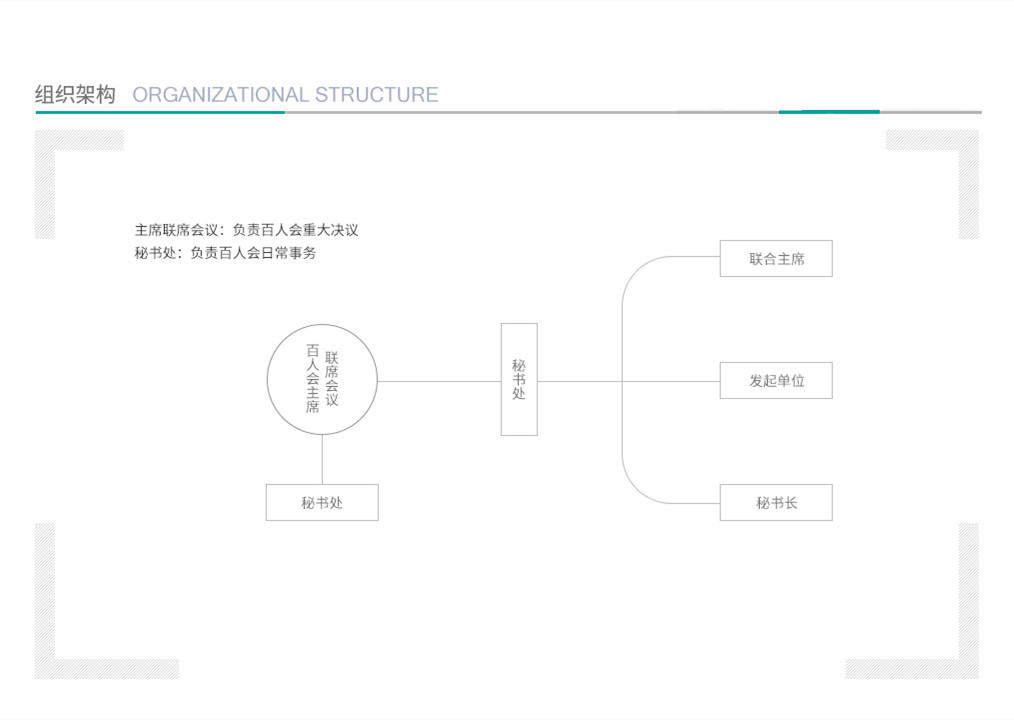 (一)主席联席会议负责百人会的重大决策,联席会议成员由联合主席、发起单位代表和秘书长组成。(二)联席会议下设秘书处,负责百人会的日常事务,秘书长由周路明担任,副秘书长由张永伟担任。(三)百人会每年召开一次年会,在每一次年会之前,由上一届主席联席会议推举产生新的主席。
