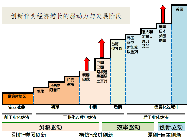 经济增长的源泉主要有三个:资源驱动、效率驱动和创新驱动。按不同的发展阶段,创新活动由低到高可分为三类:引进-学习创新、模仿-改进创新、原创-自主创新。国家发展阶段可按工业化水平划分(如下图)。尚未进入工业化进程的国家称为前工业化经济(农业社会,目前全世界还有极个别贫穷国家属于这个阶段)。正在工业化过程中的发展中国家又细为分为初期、中期和后期三个阶段。发达国家如美国,早在一百年前完成了工业化,现在已经进入信息时代,称之为后工业化经济。采用世界银行的数据,每一个阶段选取几个代表性的国家/地区。用此图可以把中国与世界在创新-发展方面的昨天、今天、明天(过去的发展、现在面临的问题、以及未来的展望)作一个简单的解释和描述。